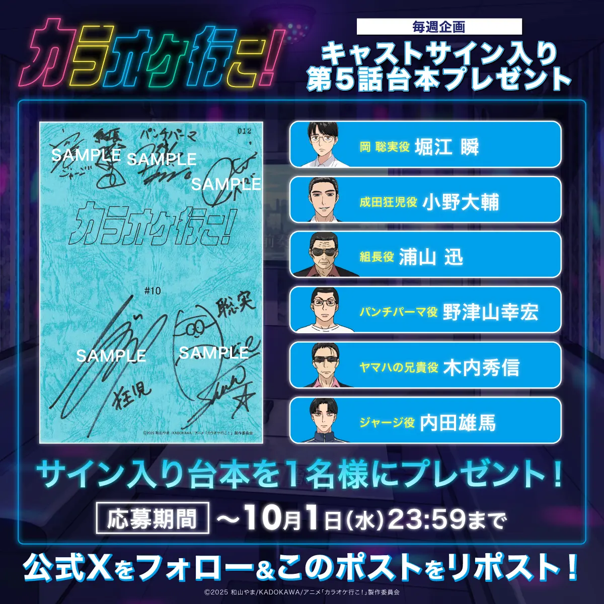堀江 瞬(岡 聡実役)、小野大輔(成田狂児役)、浦山 迅(組長役) 野津山幸宏(パンチパーマ役)、木内秀信(ヤマハの兄貴)、内田雄馬(ジャージ役) 応募締切:2025年10月1日(水)23:59まで